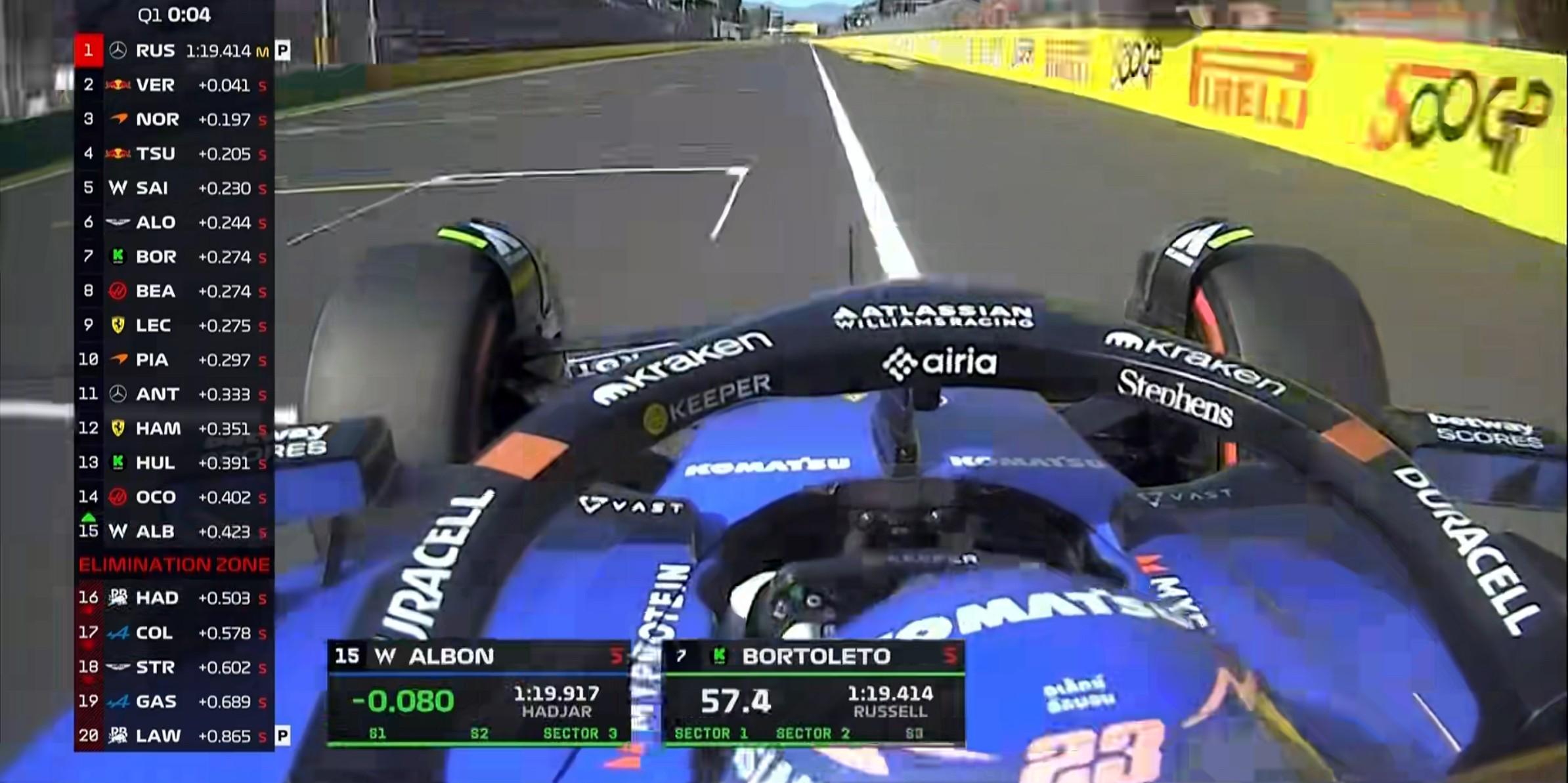 Q1首轮飞驰圈结束,两台迈凯伦领跑全场,两台威廉姆斯都出现失误未做出成绩;