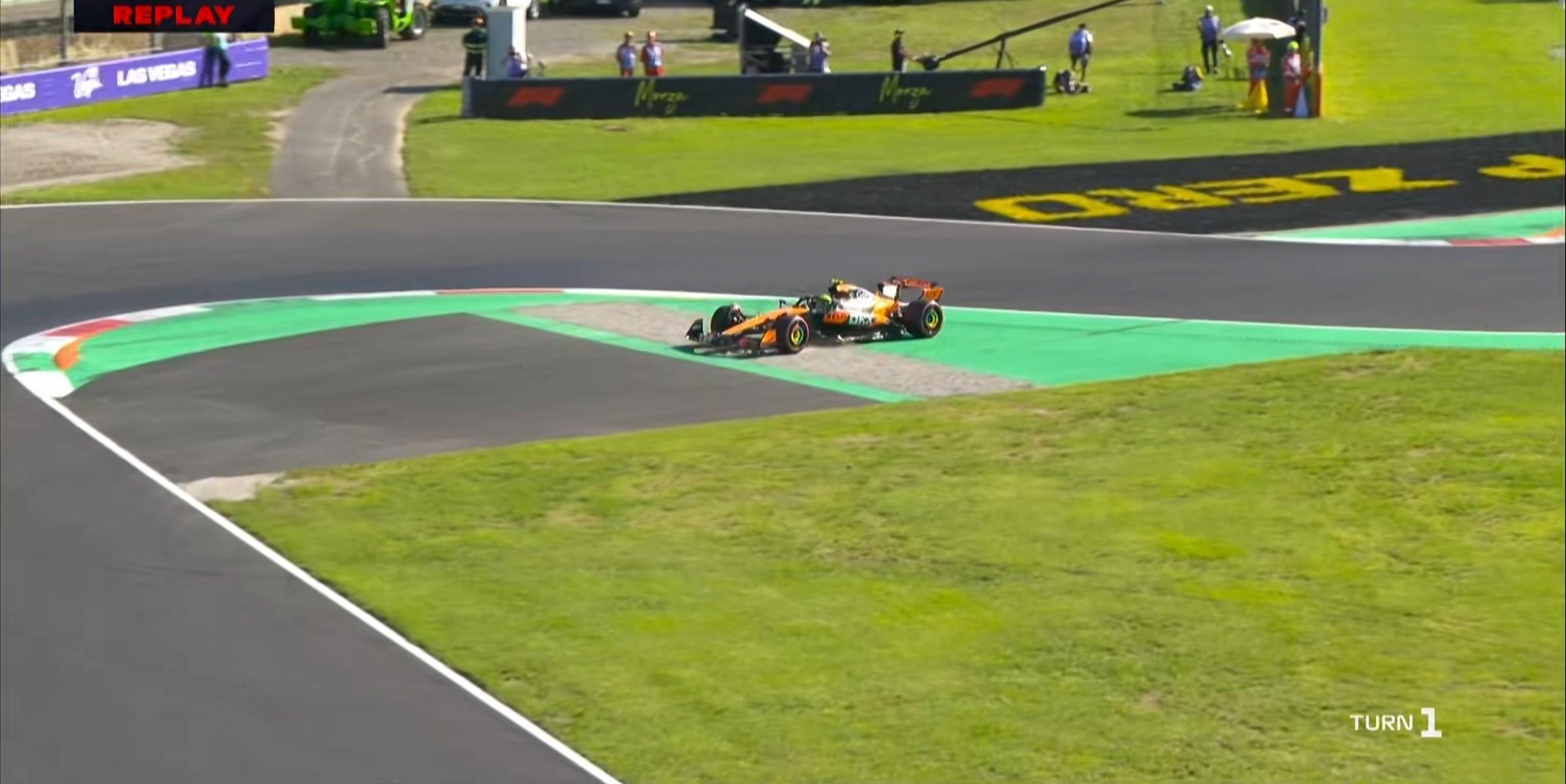 回放显示诺里斯在1号弯错过刹车点驶入2号弯缓冲区,车队也直接让其进站寻找新的窗口;